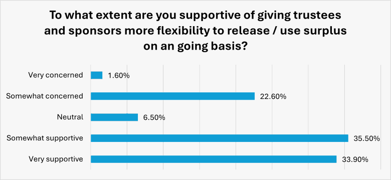When asking participants to what extent they were supportive of giving trustees and sponsors more flexibility to release / use surplus on an ongoing basis, our webinar poll showed that there is generally support for this although concerns remain.